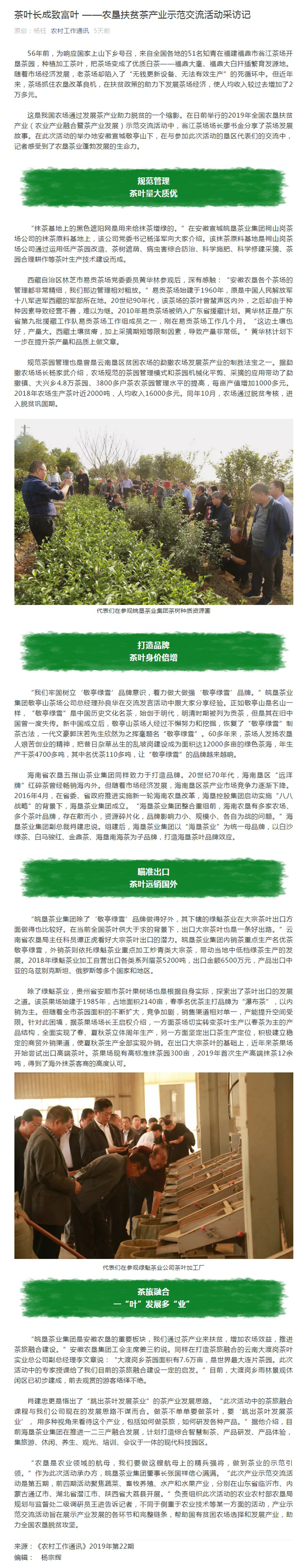 《农村工作通讯》报道:《茶叶长成致富叶 ——农垦扶贫茶产业示范交流活动采访记》