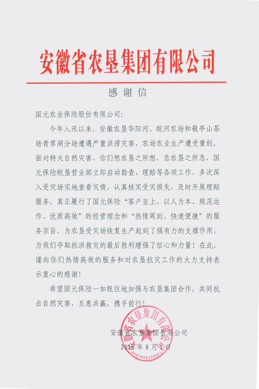 安徽农垦致谢国元保险助农场救灾