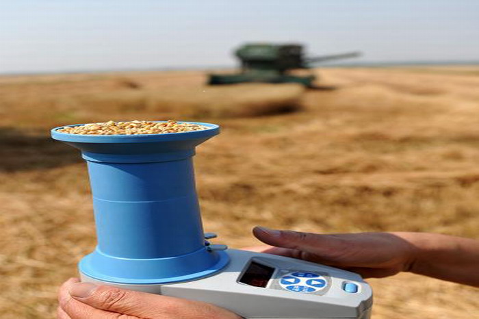 龙亢农场技术人员在良种基地检测麦子的含水量。